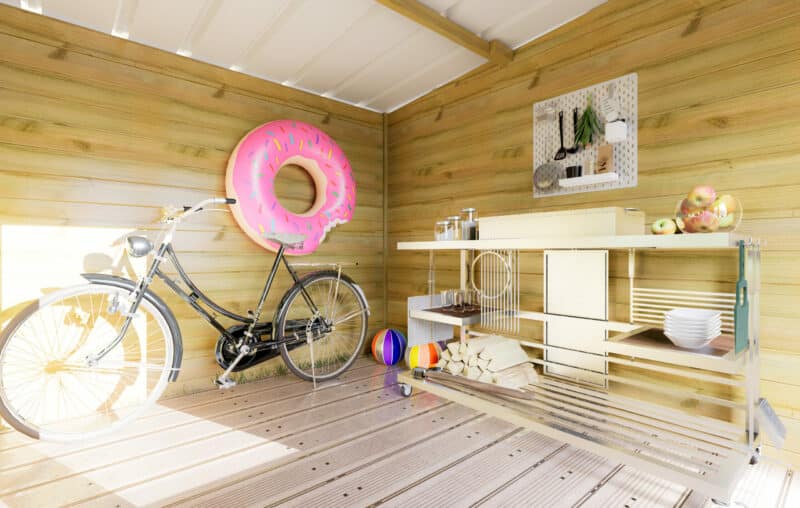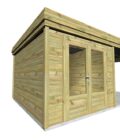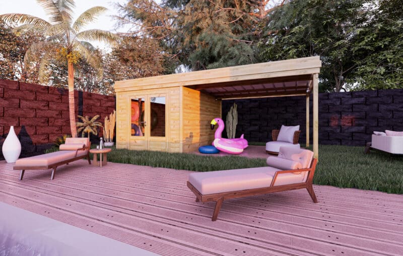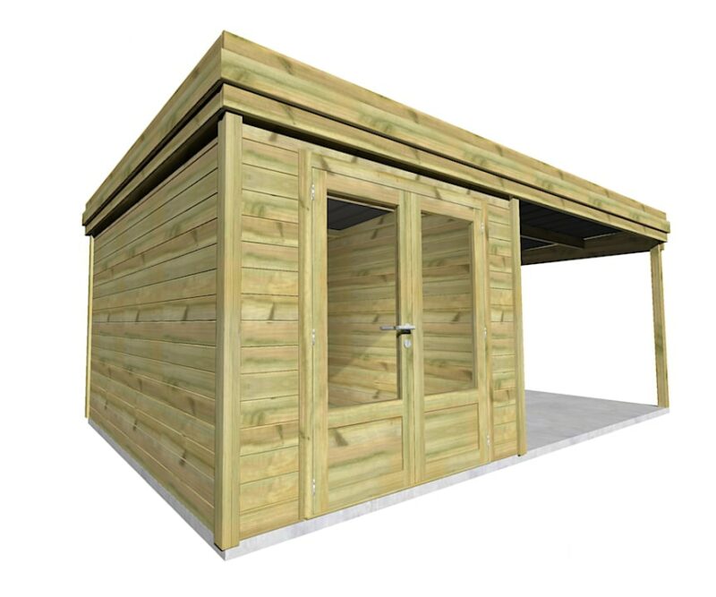 Ce modèle dispose d’une extension de toiture ce qui vous permet d’aménager un espace extérieur couvert à côté de votre abri de jardin. L’extension fait d’une surface de11,55m2