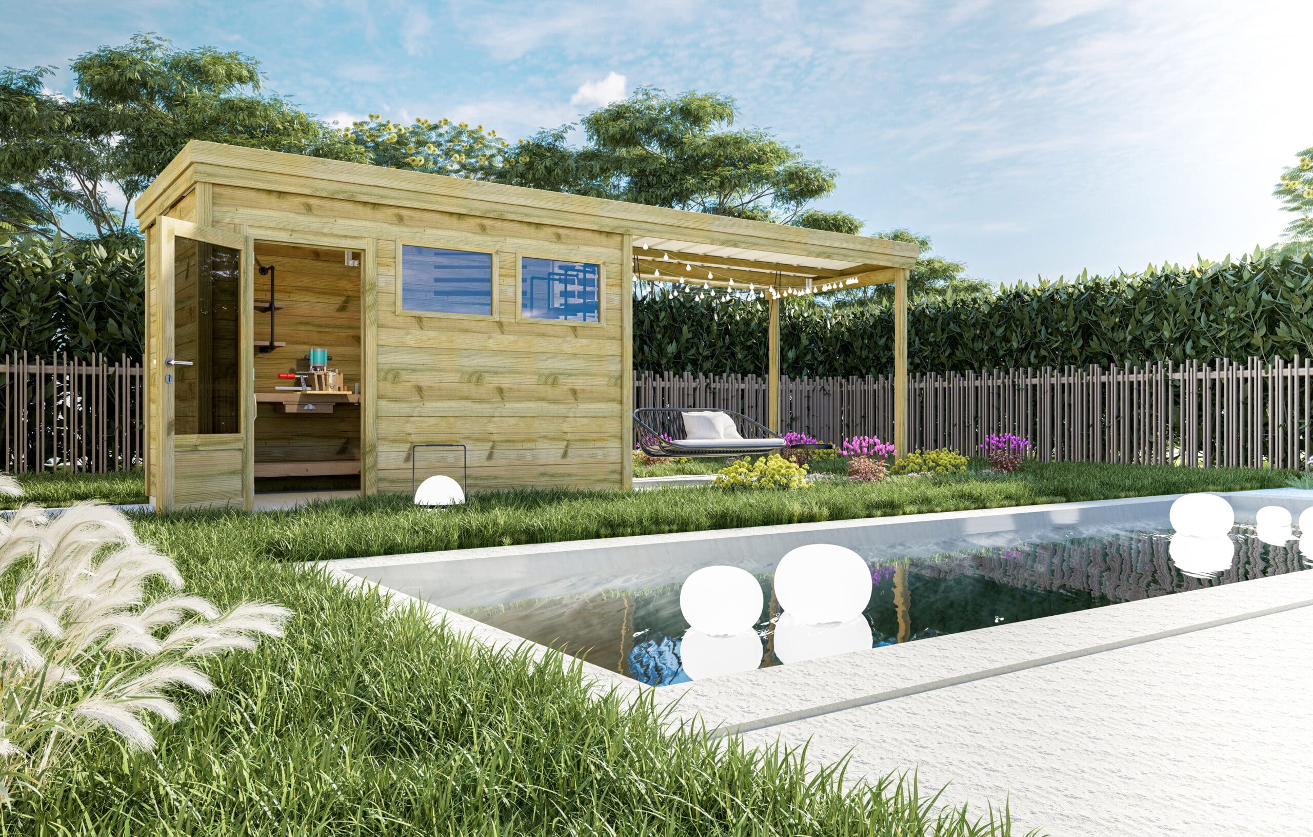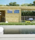 Ce modèle dispose d’une extension de toiture ce qui vous permet d’aménager un espace extérieur couvert à côté de votre Pool House Autoclave. L’extension fait d’une surface de 7m2.