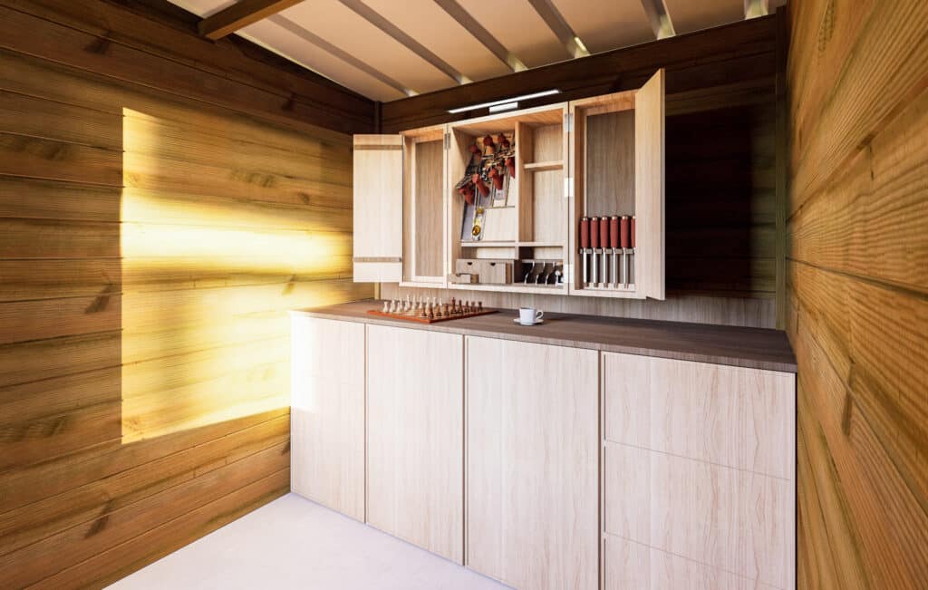 L’assemblage du produit se fait grâce à des poteaux rainurés et des planches massives de 27 mm qui se glissent dans les rainures et qui s’emboitent entre elles.
